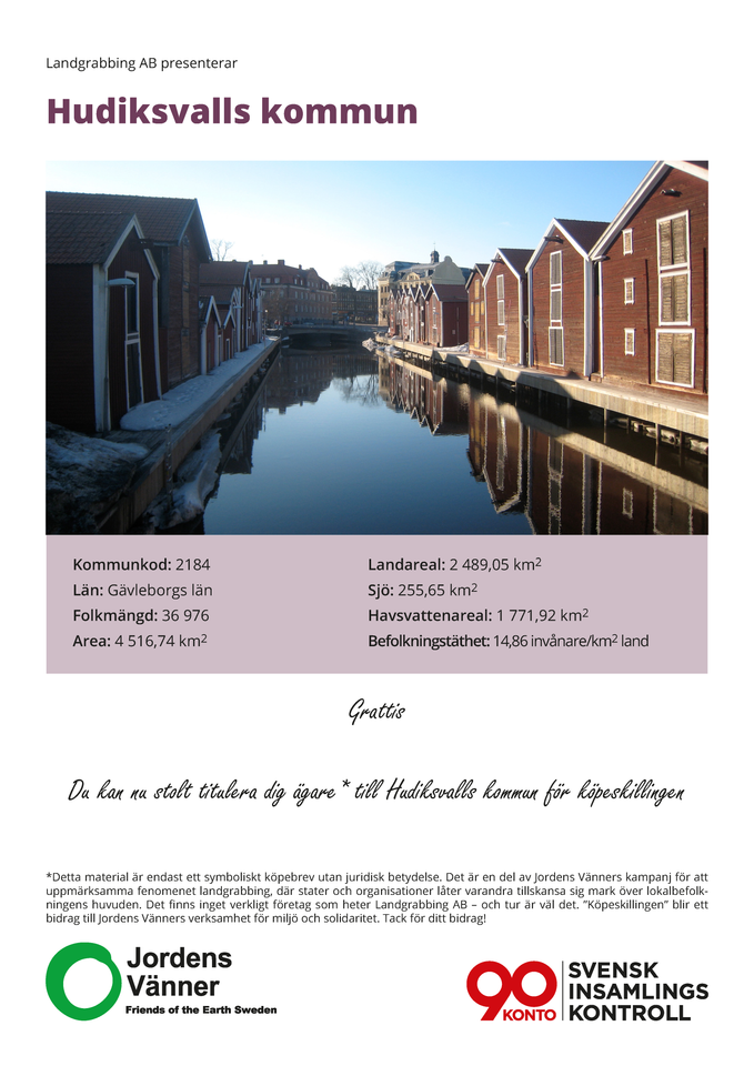 För att uppmärksamma problemet med landgrabbing säljer vi ut alla Sveriges kommuner för 150 kronor. Ge bort just din favoritkommun!